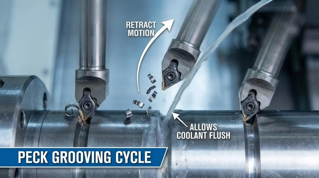 How you program the tool path is just as important as the tool itself. For deep grooves (Depth > 3x Insert Width), continuous plunging is dangerous. We recommend Peck Grooving, similar to peck drilling.