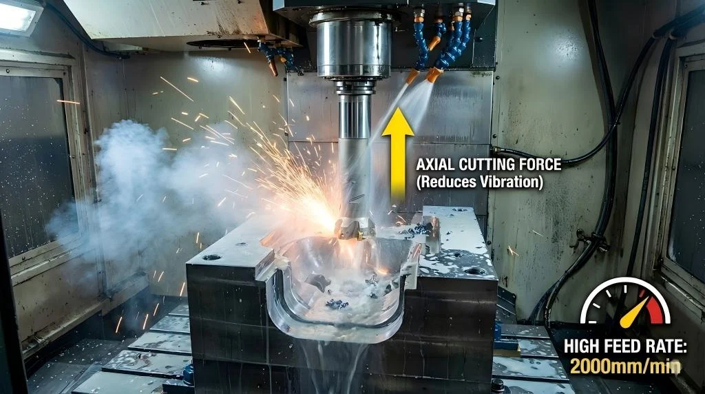 Because the lead angle is so small, the actual chip thickness is only a fraction of the programmed feed rate. This allows you to program incredibly high feed rates (e.g., 2.0 mm/z) while keeping the actual load on the cutting edge (hm) at a safe, standard level (e.g., 0.2 mm).