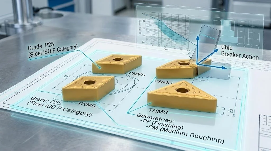 Because the speed is near zero at the center, the inner insert is subjected to immense compressive forces rather than high-speed shearing. The metal tends to tear and pressure-weld itself to the carbide, causing Built-Up Edge (BUE). To survive this harsh, slow-speed crushing environment, the inner insert must be manufactured from an extremely tough carbide grade (high cobalt content) and typically features a PVD coating to maintain a razor-sharp edge that resists BUE.