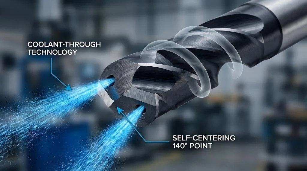 Modern solid carbide drills feature helical internal coolant channels. Coolant is pumped through the drill body at high pressure, exiting directly at the cutting tip. This: